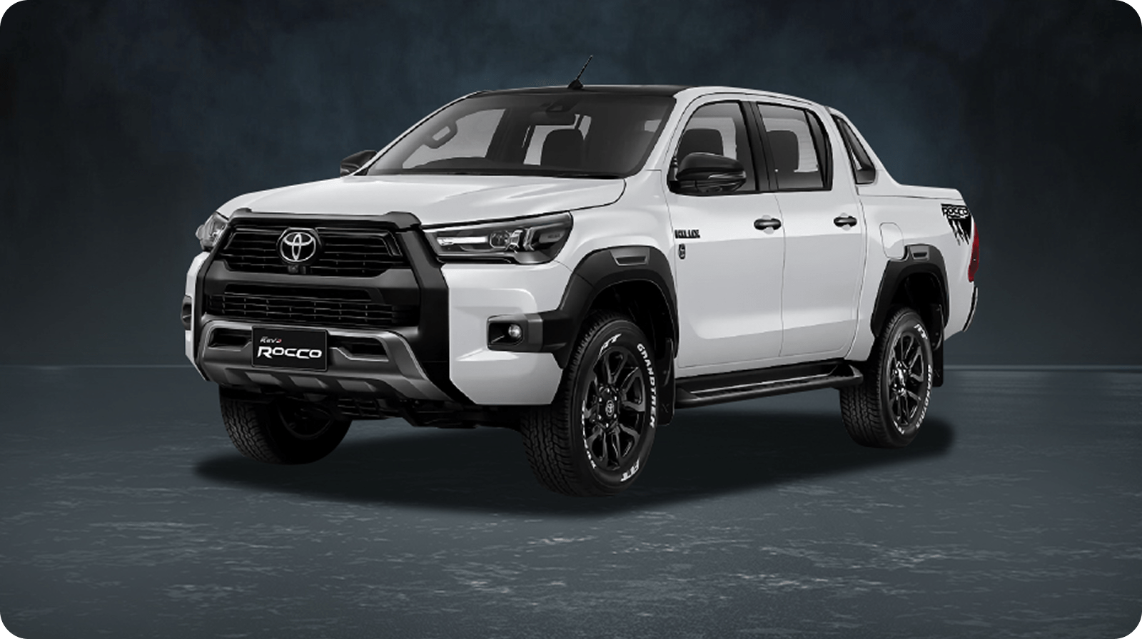 Silver Toyota Hilux pickup truck with extended cab and rugged design, studio front-side view.